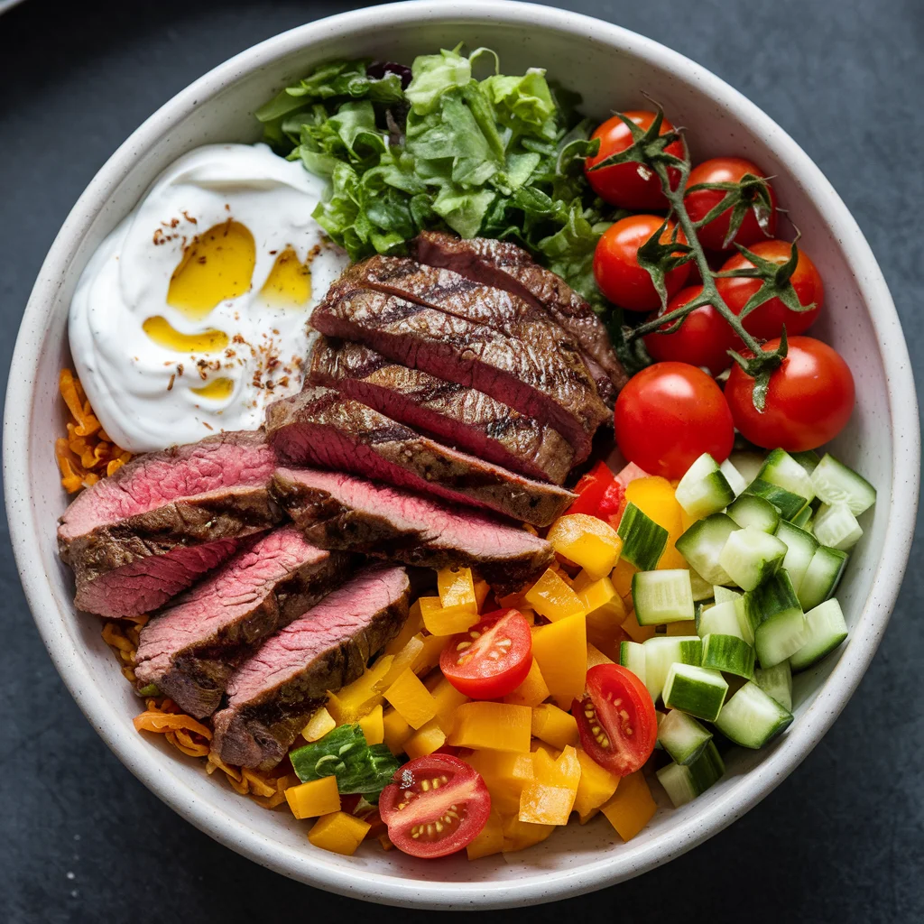 Layer the fresh veggies in a bowl, top with warm slices of steak, and crown it all with a generous spoonful of yogurt sauce.